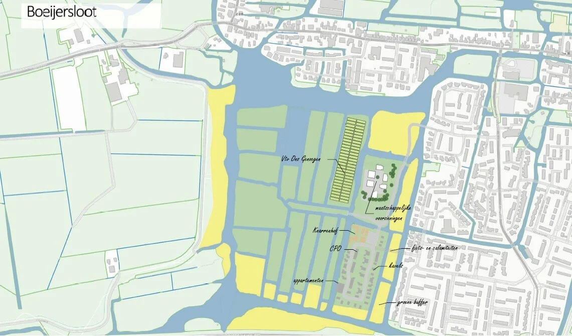 Aansluitend op het gemeentelijk eigendom heeft de Segesta Groep percelen in eigendom. En, natuurlijk, zij zijn als ontwikkelaar niet tegen het bouwen over de Boeijersloot en willen daarbij ook wel rekening houden met de bouw van een 'knarrenhof'. Hierboven een eerste idee de hele strook tussen het volkstuinencomplex en de bebouwing tot ontwikkeling te brengen.